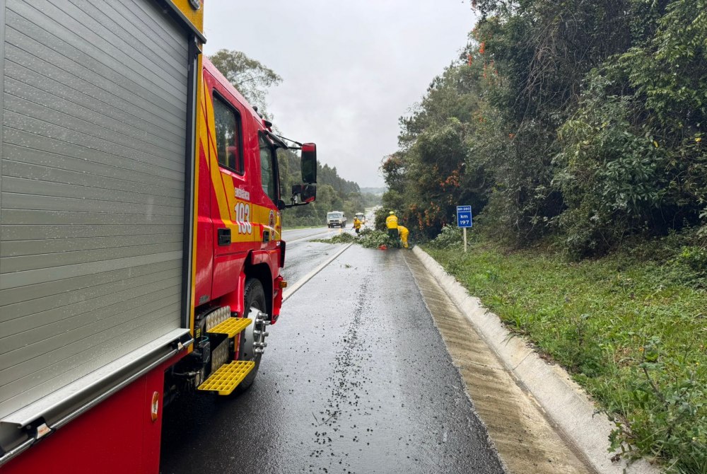 O Corpo de Bombeiros Militar de Mafra foi acionado por volta das 11h04min para atendimento de ocorrência de queda de árvore sobre a rodovia, nas proximidades do trevo da localidade de Saltinho do Canivete, no km 194, na BR-280.