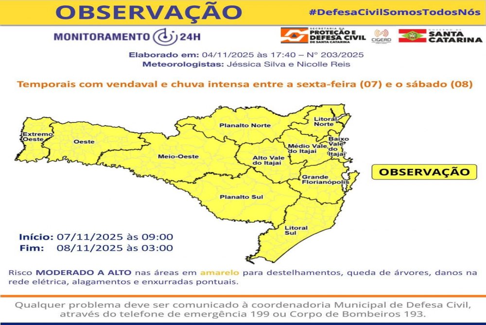 Entre esta sexta-feira (07) e o sábado (08) o processo de formação de um ciclone extratropical em alto mar, entre a costa do Sul e do Sudeste do Brasil, favorece o desenvolvimento de temporais com vendaval, chuva intensa, raios e queda de granizo em Santa Catarina. O risco é moderado a alto para ocorrências associadas a destelhamentos, danos na rede elétrica, queda de galhos e árvores, alagamentos e enxurradas.